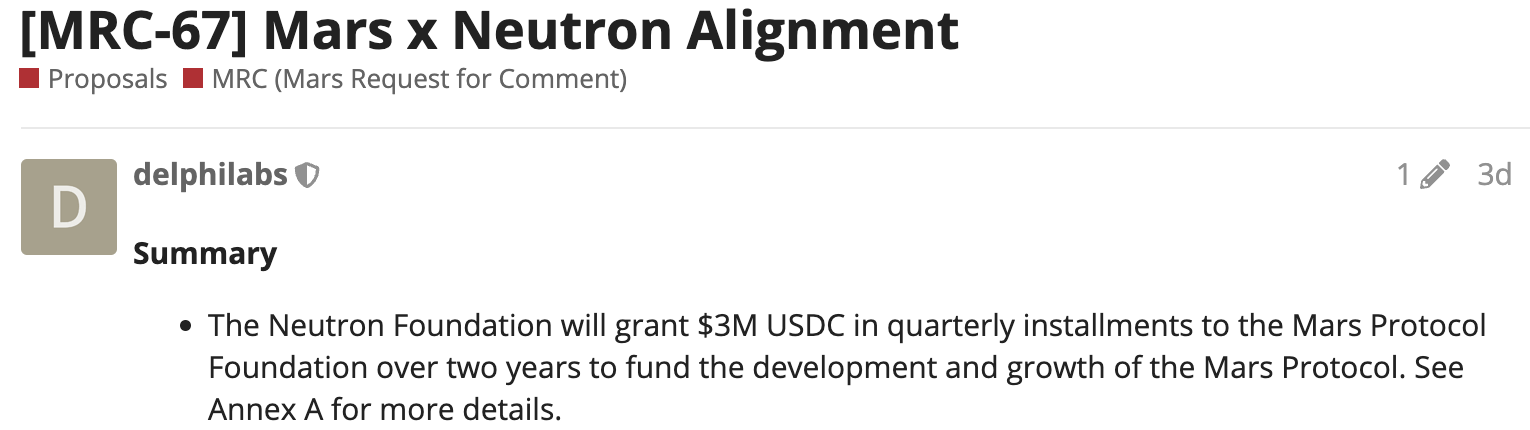 Additionally, Neutron has proposed to integrate the Mars app chain into the Neutron chain. The Mars protocol currently holds the position of the largest credit protocol within Cosmos, generating revenue across various chains, particularly on Osmosis. Neutron aims to bring Mars onto its chain to enhance the chain's GDP, offering 3 million per quarter for this acquisition-like integration. This move has sparked discontent from Osmosis, a direct competitor of Neutron.