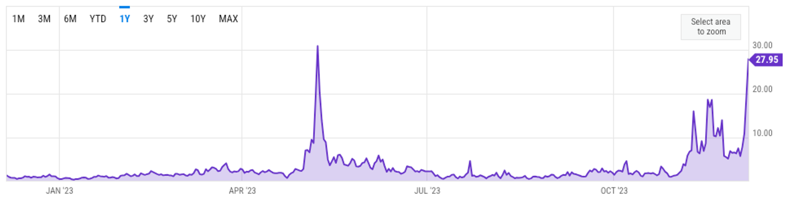 On the speculative side, tokens like $ORDI went from a low of $2.89 in September to December’s $63 all-time high, with a staggering 21.7x return. Others, more recent, like $SATS and $MUBI follow suit. Developers are heads-down building decentralized applications that use the Bitcoin network as their base layer, though the current user experience is years behind Ethereum.
