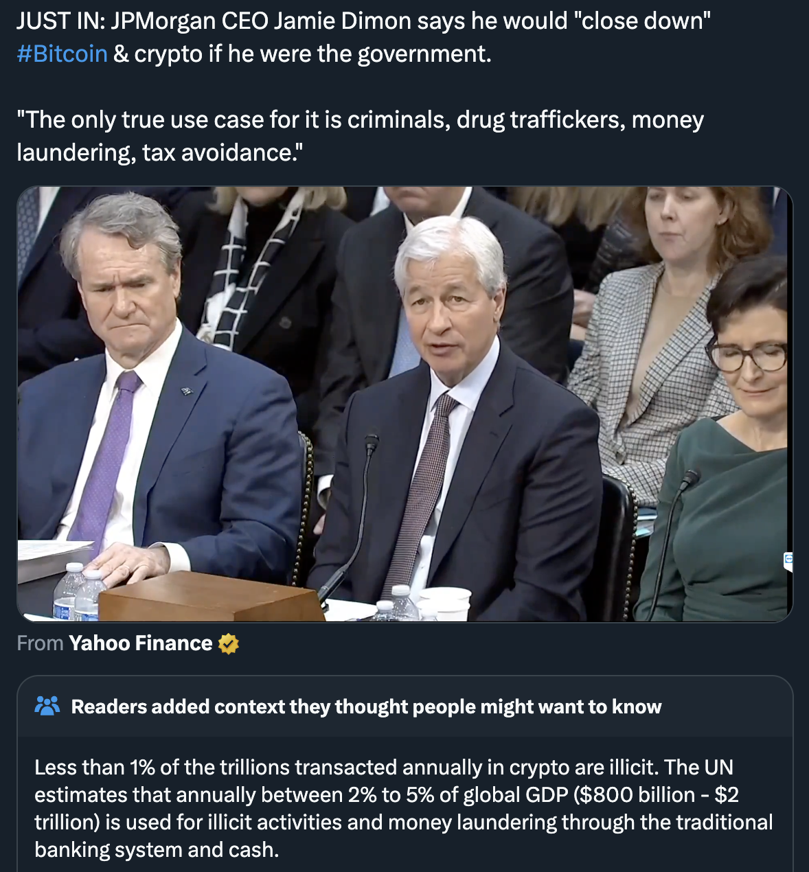 - JPMorgan Chase CEO Jamie Dimon said he would shut down crypto if he were the government. Twitter Community notes had something to point out: