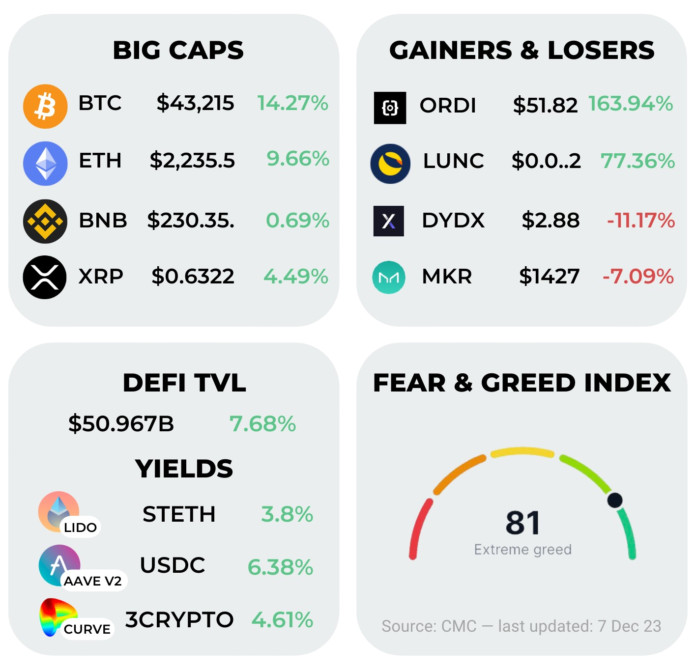 Yes, the bull market has officially begun. Bitcoin has surged by an impressive 14%, overperforming all other major coins, and now comfortably sits above $40,000. The DeFi TVL has also experienced a significant uptick, the stablecoin market cap is increasing, and yields are becoming more attractive. We're back, baby.