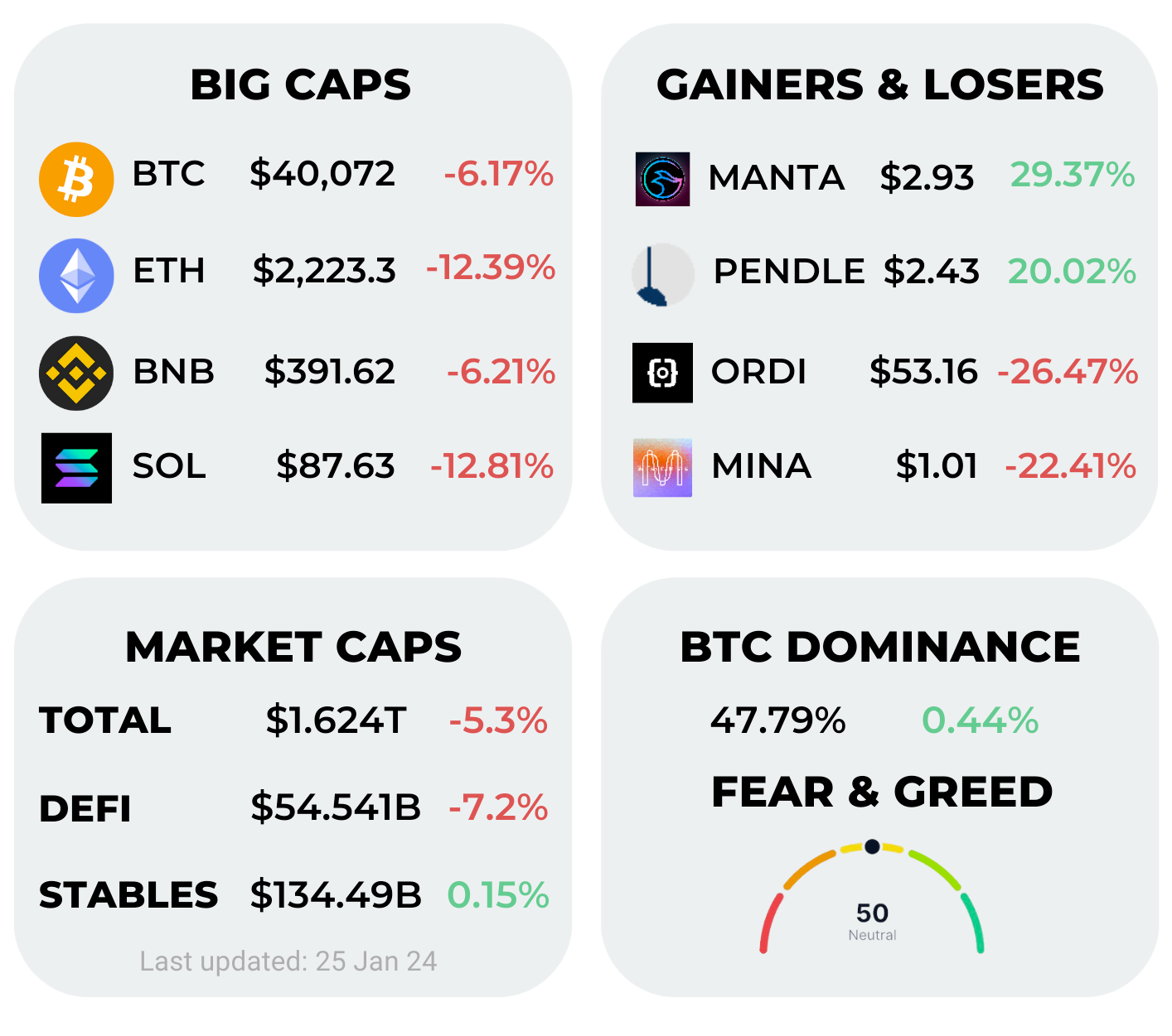 The market bled as hell this week🩸, with Bitcoin dropping 6.17% and Ethereum by almost double. One possible reason for this could be Grayscale investors selling off their GBTC holdings, as the fund has been converted into an ETF. We'll delve into this story in more detail shortly. As is often the case, when Bitcoin takes a hit, the entire market tends to follow suit. Altcoins in general, have witnessed significant losses.