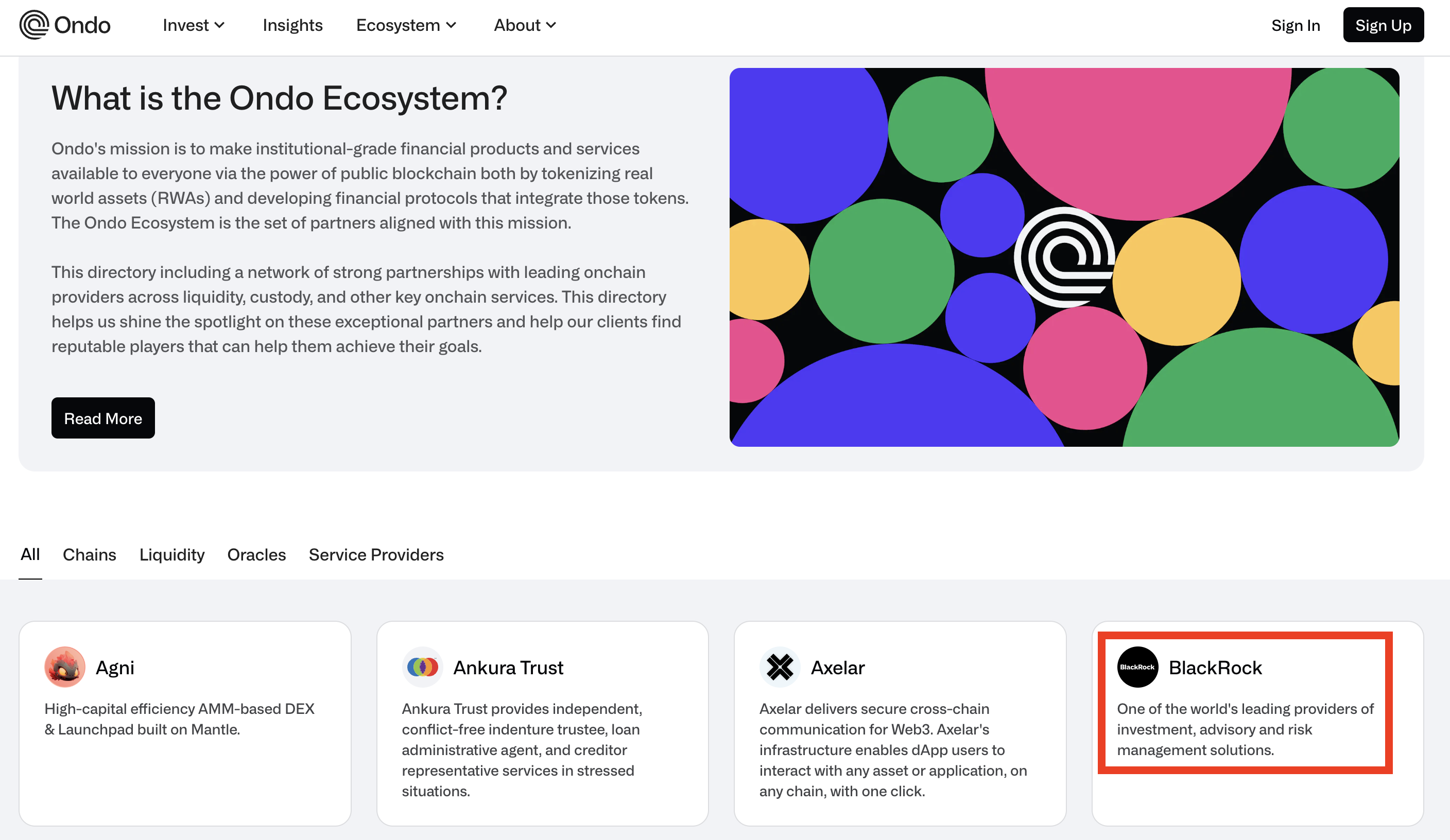 Important names are backing the project, such as Pantera Capital and Coinbase. The CEO, Nathan Allman, comes with a background in Tradfi from Goldman Sachs' digital assets department. And, interestingly, Ondo seems to be in partnership with the largest asset manager in the world: