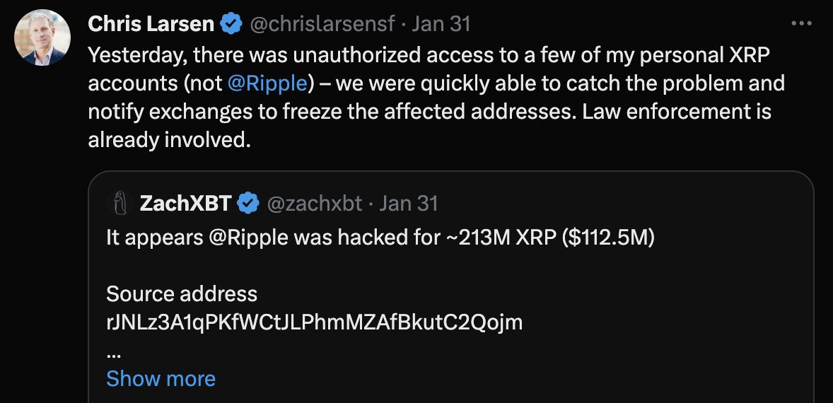 Larsen confirmed the incident, stating that there was unauthorized access to some of his personal wallets, but he reassured that Ripple company's wallets remained secure and unaffected by this breach. In response to the hack, he mentioned that law enforcement is already involved and that steps were taken to freeze a portion of the stolen assets.