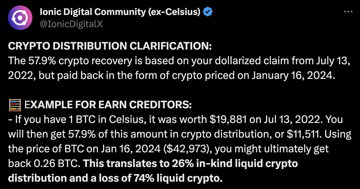 But there’s a but: the method used to calculate the returns for Celsius account holders wasn't exactly fair. “Calculated at the bottom and paid back at the local top.” The valuation is based on crypto market lows, leading to repayments in dollar amounts that significantly undervalue the current worth of these crypto assets, leaving account holders with much less than their current market value.