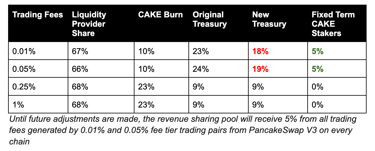PancakeSwap recently announced further efforts to make CAKE deflationary and the DEX sustainable in the long-term. Following the launch of PancakeSwap v3 (which is forked from Uniswap v3), CAKE fixed-term stakers will enjoy 5% of trading fees generated on pairs that feature a 0.01% and 0.05% fee structure.