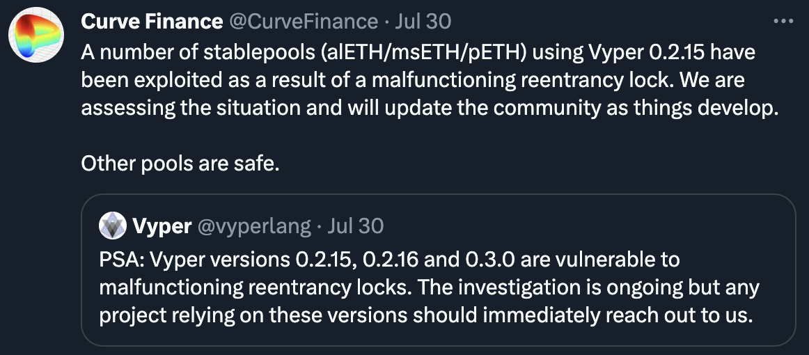 Factory pools let anyone set up a liquidity pool on Curve using a ready-made "factory" framework. The attacker had their eyes on factory pools from several projects: $11.4 million vanished from JPEGd’s pETH-ETH pool, $1.6 million from Metronome’s sETH-ETH pool, $13.6 million from Alchemix’s alETH-ETH pool and a jaw-dropping $25M was funneled from the CRV/ETH pool. The exploit was carried out using flash-loans, taking advantage of a vulnerability in specific versions of Vyper (the smart contract programming language). The hacker exploited the Vyper compiler, which means that other Vyper smart contracts across DeFi could also be at risk.