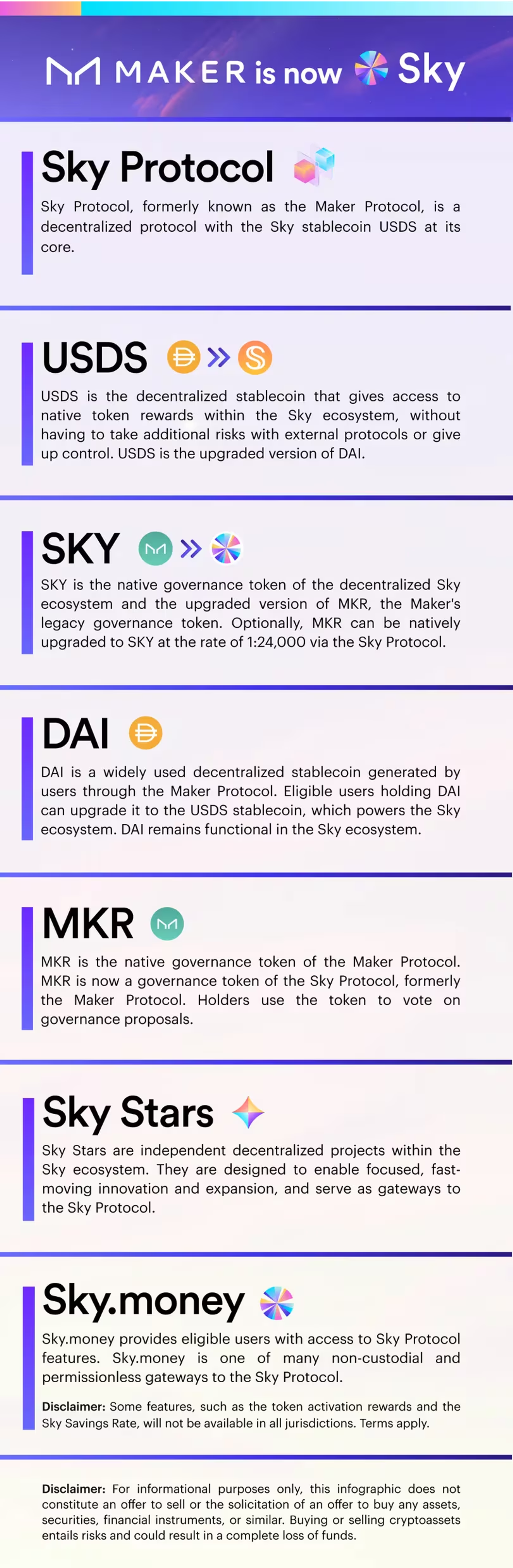 Part of Maker’s endgame plan, the company is undergoing significant renovations. Starting September, 18 users will be able to migrate 1:1 DAI to USDS, a new kind of decentralized stablecoin aiming to simplify yield strategies by offering in-house solutions on ‘Sky’ rather than having to roam around blockchains to get the best yield. Furthermore, users will also have the option to migrate 1:24,000 MKR tokens to SKY tokens — the reason here might simply be unit bias, so that tokens are perceived as more valuable despite being the same as before, just in a different ratio. To complete it, Maker itself will rebrand to ‘Sky’ changing its whole brand image, website, etc. with other entities built around it (e.g. SparkLend) to be called ‘stars’.