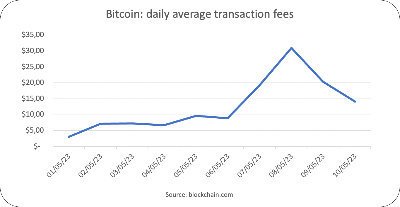 This meme-coin mania comes at a cost, though. Bitcoin fees peaked at $30.91 per transaction on average on May 8, while yesterday, the previous transactions ATH was nearly broken with 671K registered transactions in a single day. This makes it hard for retail traders wanting to speculate on the trend, and even for those who don’t — countries that adopted BTC as legal tender, like El Salvador, are in a difficult situation right now due to high transacting costs. Exchanges scrambled for solutions, with Binance increasing withdrawal fees for the Bitcoin network ($27.5 currently) and pushing Lightning network adoption — a Layer2 solution allowing faster and cheaper transactions. Moreover, Binance committed to enabling support for NFT Ordinals by the end of May.