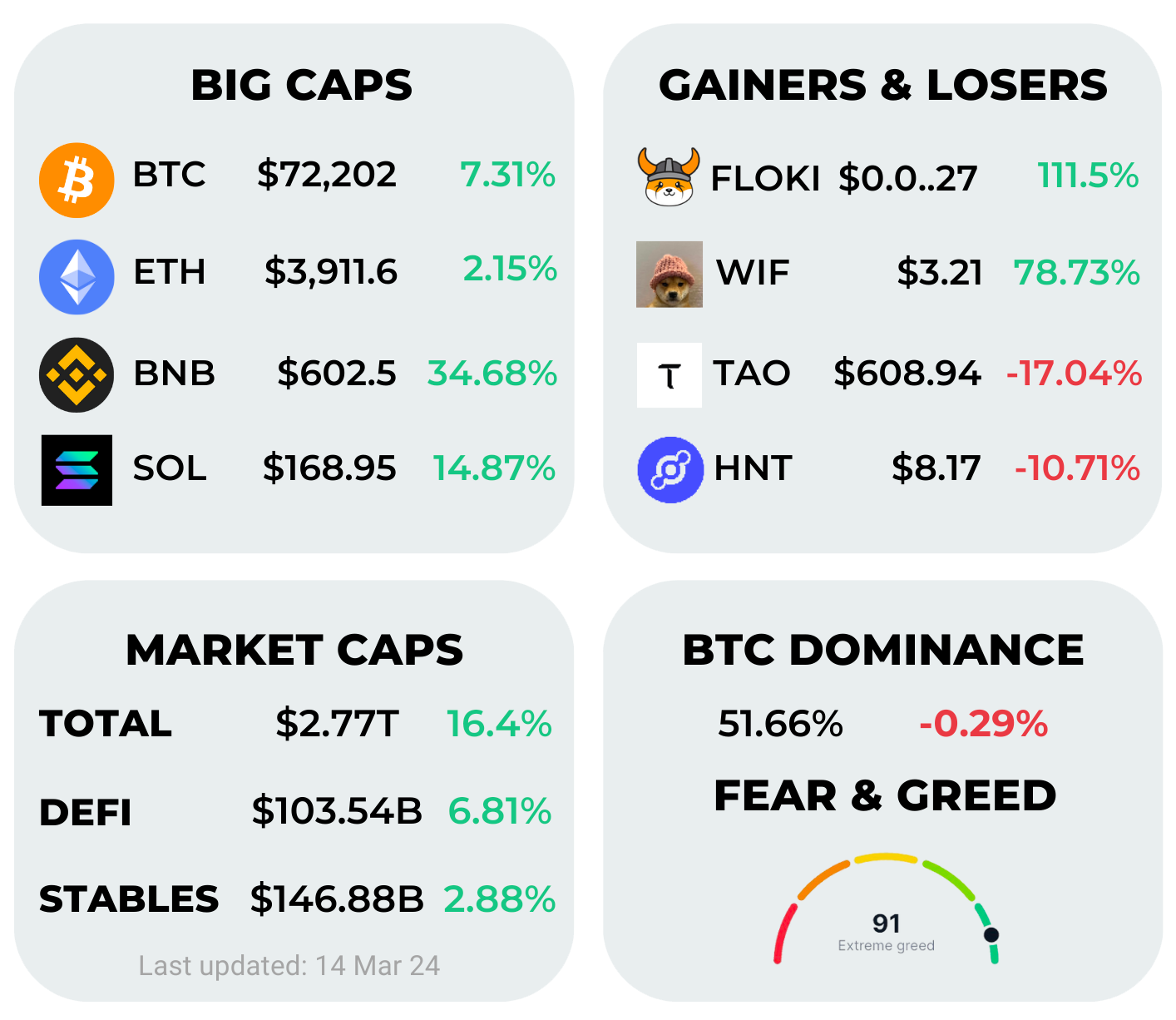 The bull market is officially here, with lots of green numbers. This week, Bitcoin hit a record high of $74,000, and Ethereum also did well, surpassing $4,000. However, Ethereum has struggled since yesterday's Dencun upgrade. Is this a "sell the news" case?