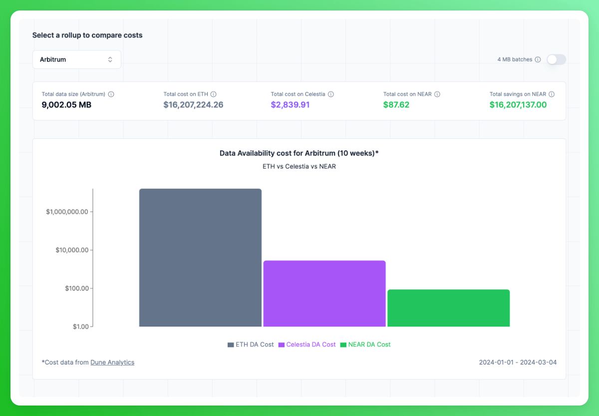 You can clearly see how the upgrade hugely affects L2s, while Ethereumโs mainnet fees remain unchanged. Moreover, data availability is also becoming radically cheap. Until now, roll-ups primarily used Ethereum for data storage. However, costs are dropping dramatically with new options like Celestia and Near. Here's a bar chart showing the differences in cost: