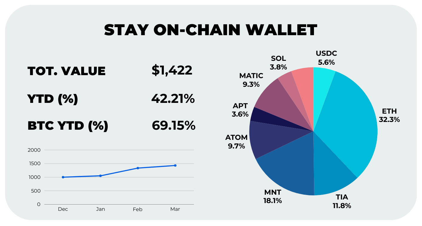 Our on-chain wallet hasn't seen much change since last week. We're mostly invested in altcoins, so our value stayed the same while Bitcoin saw significant gains. Our small Solana investment did well, but it's a tiny part of our portfolio. We're sticking to our strategies, aiming to beat Bitcoin's performance in this bull market. For more details, check our Google sheet here.