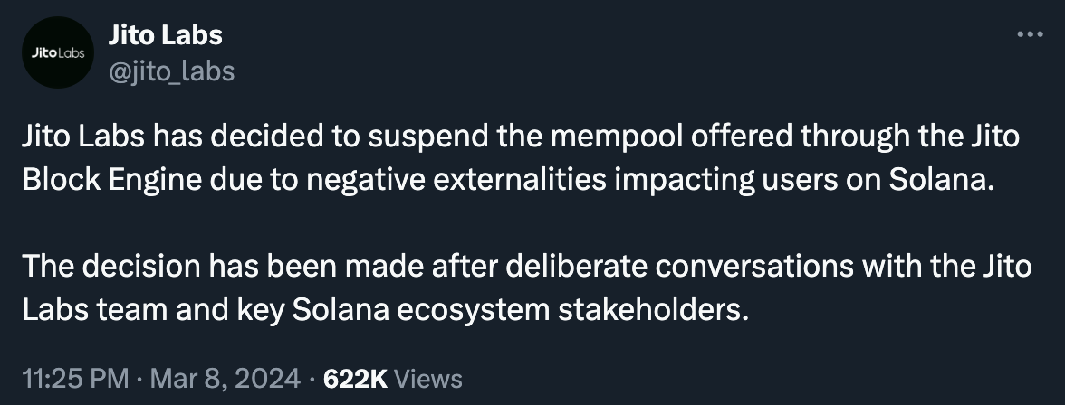 The decision by Jito Labs to pause its mempool feature has sparked significant debate among engineers, with valid arguments on both sides. While pausing the feature may improve the on-chain experience temporarily, it doesn't stop individuals from conducting MEV operations privately and profiting from them. Whereas Jito Labs made its software available to all, enabling the distribution of MEV revenue to its stakers, individuals could now run similar operations privately and retain all profits for themselves.