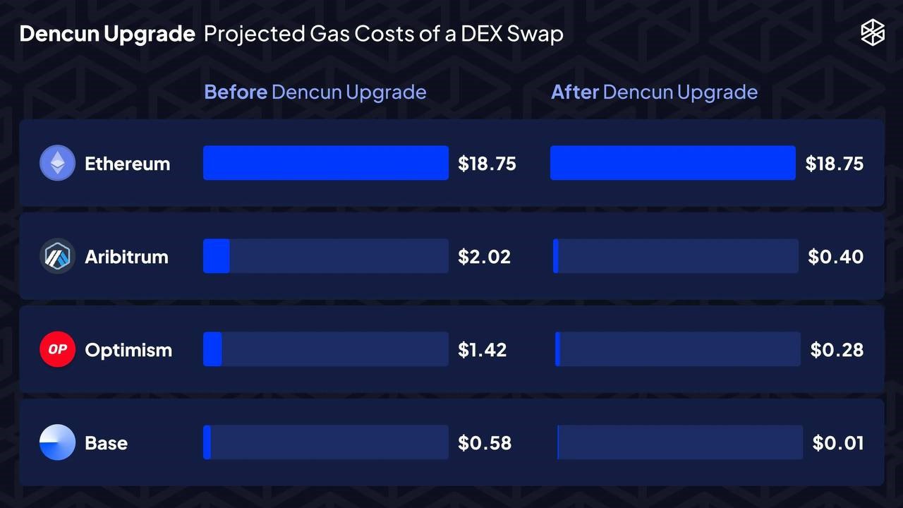 Yesterday, the Ethereum network was updated with the Dencun upgrade. Dencun is designed to significantly lower Ethereum roll-up fees by introducing blob transactions, known as EIP-4844, or protodanksharding. Let's check some stats on how itโs going to affect the Ethereum ecosystem: