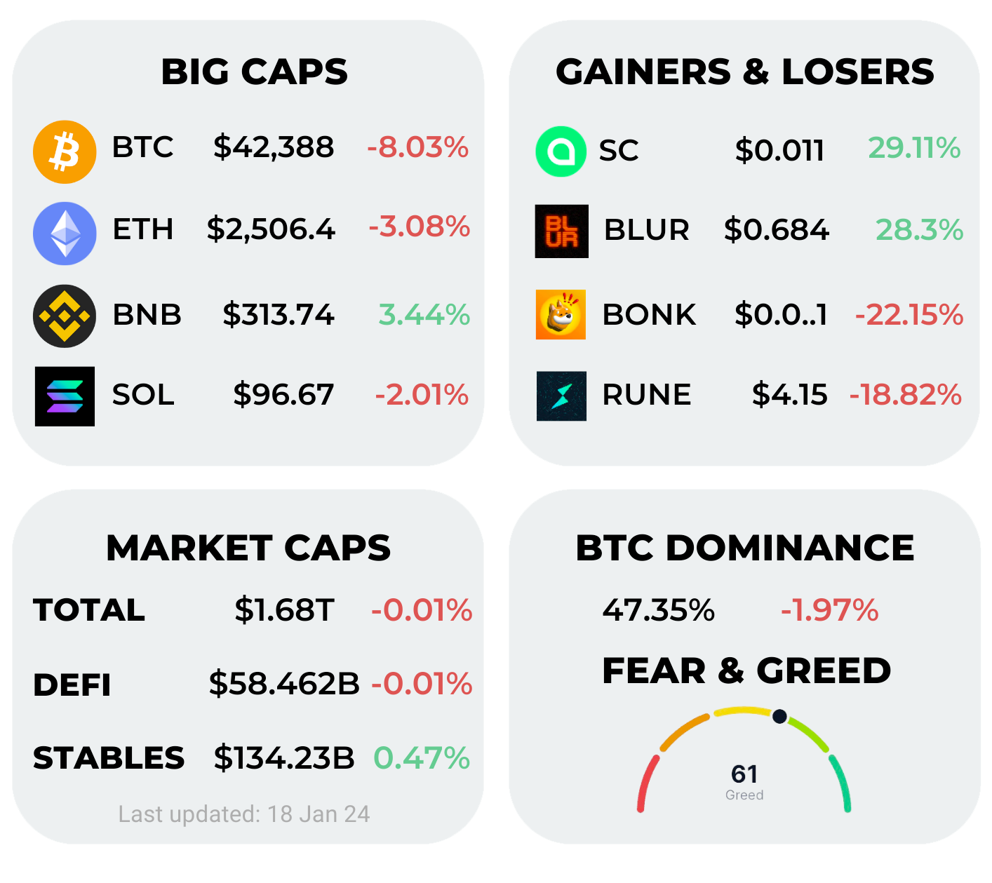 Alright, dear readers, brace yourselves for some red numbers this week. Just like Cobie perfectly predicted, the Bitcoin spot ETF launch turned out to be a "sell the news" event. Those who hopped on the ETF through their stock trading apps got a not-so-friendly -8% as a welcome gift. Ethereum took a milder hit, sliding down just 3%.