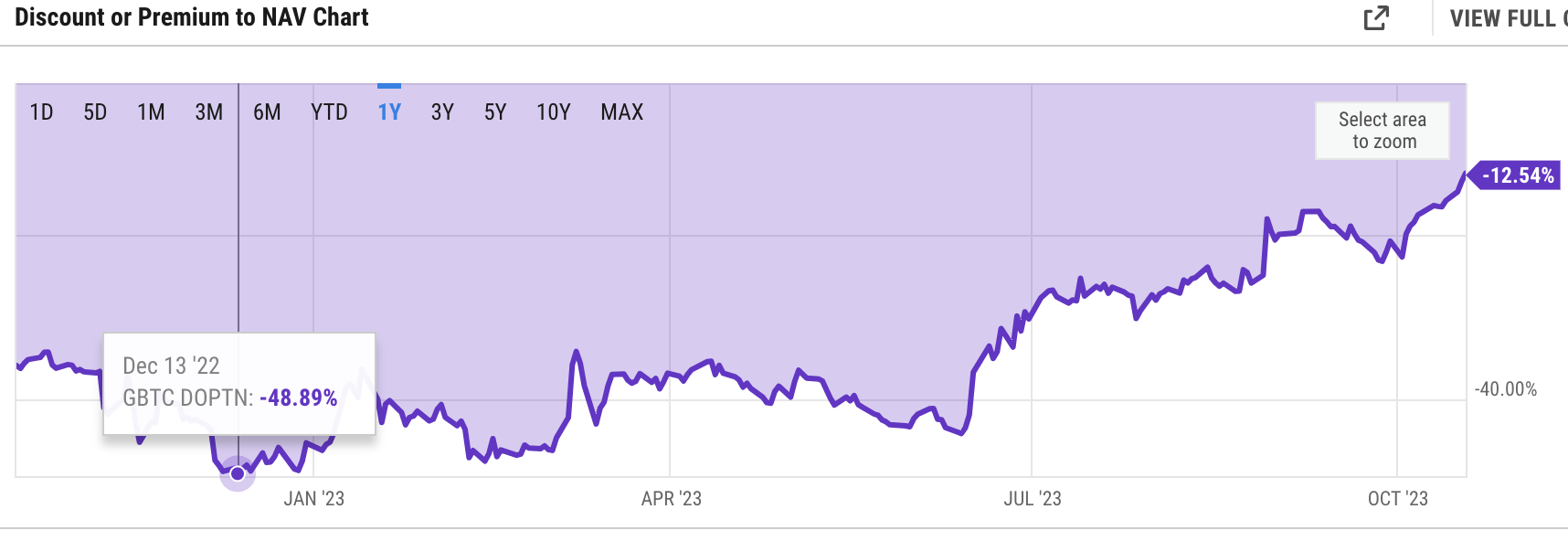 Grayscale's GBTC price is finally bridging the gap. During the past year, GBTC's price had been detached from BTC's price. The difference in price was mainly a result of significant GBTC selling triggered by the bear market and limited arbitrage opportunities. The discount offered by GBTC had reached very high levels, peaking at almost 50% below the Bitcoin market price in December last year.