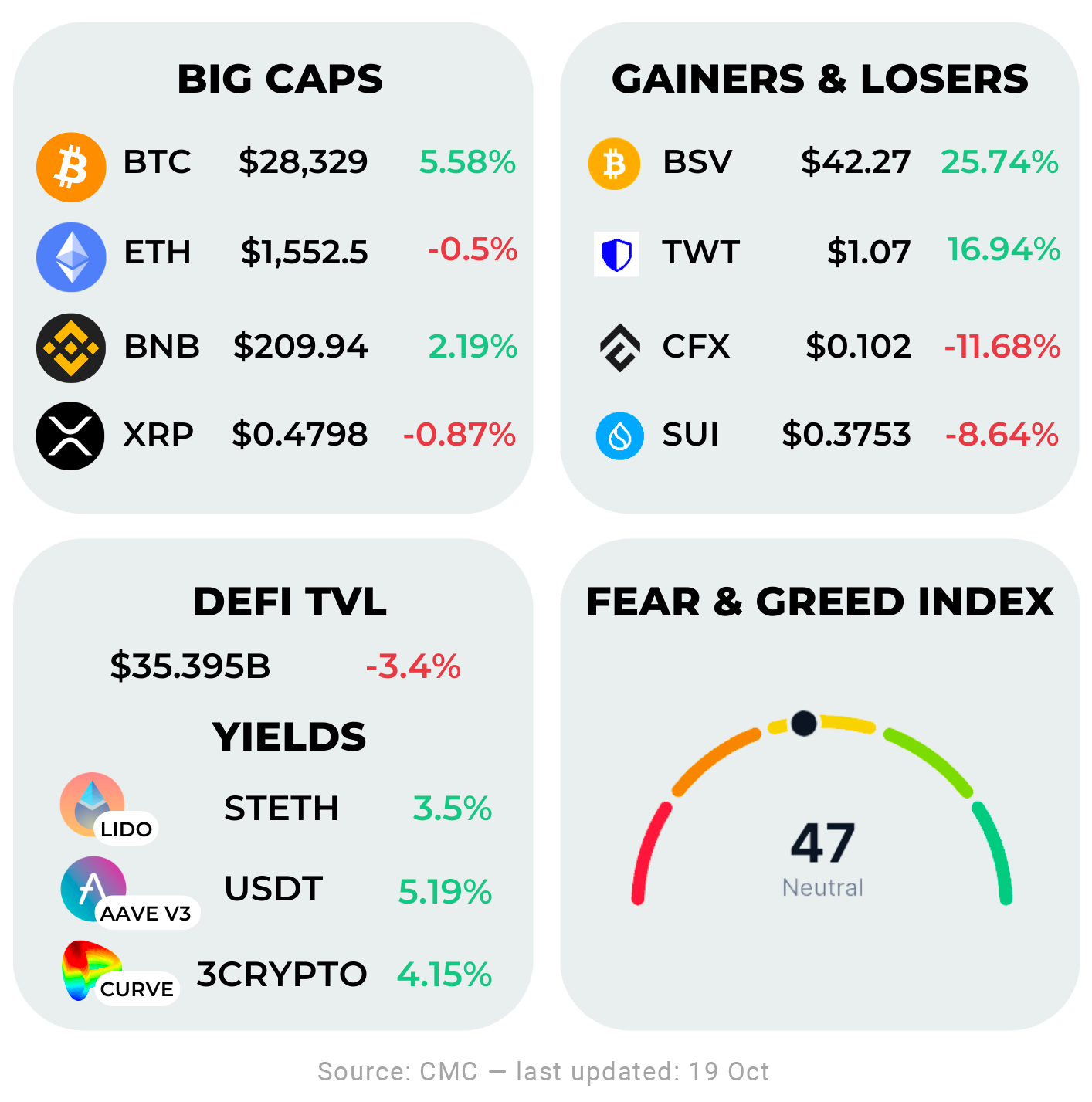 This week's market was a wild ride. Cointelegraph tweeted about BlackRock's supposed approval of a Bitcoin ETF, which sent prices up by more than 10% in less than an hour. However, this excitement was short-lived as the news turned out to be false, causing the market to retract its gains almost immediately. In addition to the high volatility, Bitcoin variants appeared to perform well. Conflux and Sui instead, are the top losers of this week. Both coins were hyped during the previous leg-up, causing overextended price charts.