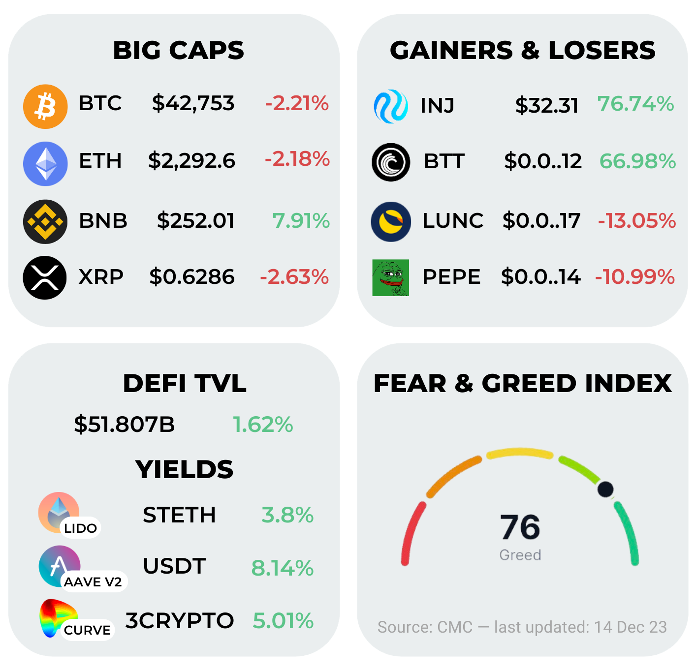 The standout performer of the week is Injective's INJ, a cosmos chain optimized for finance and aiming to challenge Solana with its speed. On the flip side, the week's worst performers are LUNC and MEME, both classified as purely speculative coins.
