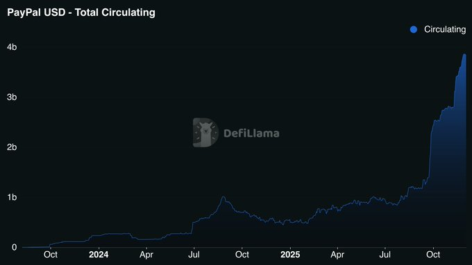 PayPal’s PYUSD. PYUSD went from ~$1.2bn in September to over $3.8bn today. That’s a payments giant pushing on-chain rails because it makes economic sense. A bit boring but real.
