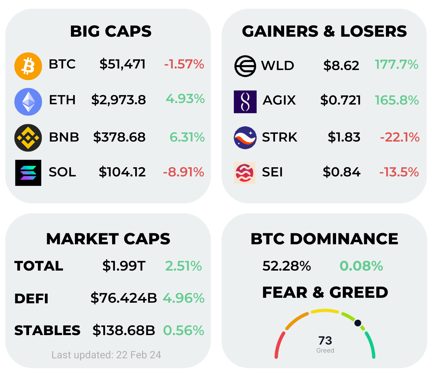 The stars of the week are WLD and AGIX, the AI coins. They were riding high on OpenAI's latest launch of Sora. WLD, for instance, shot up by a whopping 177%. Not all coins are partying; SEI and STRK are feeling the blues, especially STRK after its recent token airdrop.