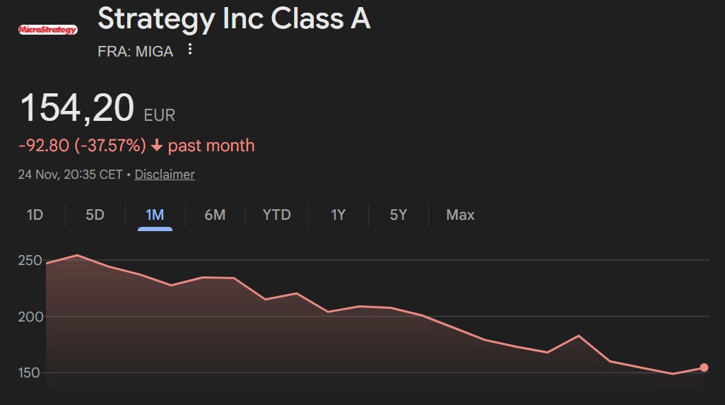 MSCI is reportedly considering removing MSTR from its indexes because the company no longer behaves like a traditional operating business. Too much of its market cap and risk profile is now tied to Bitcoin, which clashes with how equity index classifications work. MSTR looks, moves, and prices like a Bitcoin vehicle, not a software company. And it’s not doing great: