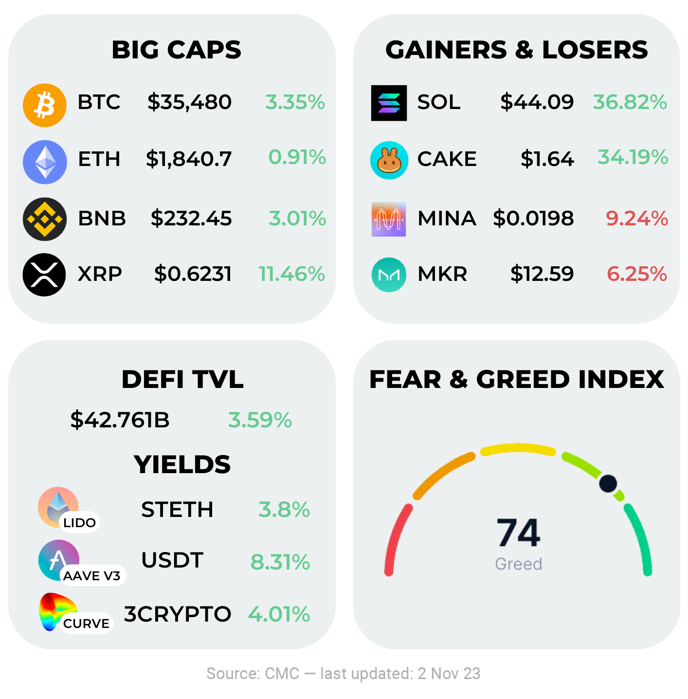 FTX’s bags are pumping, yeah. Solana is this week's top performer, thanks to the announcements at the Solana Breakpoint conference. On the other hand, Mina and Maker faced a downturn, possibly linked to their recent price overextension. The sentiment on 𝕏 is mostly bullish, nudging the feeling of a new bull market. Notably, the FED did not raise interest rates yesterday, which, despite already being high (5.25%), is seen as positive news for the market. A notable insight is the increase in USDT’s APY on Aave, indicating one thing — people borrowing to leverage their positions.