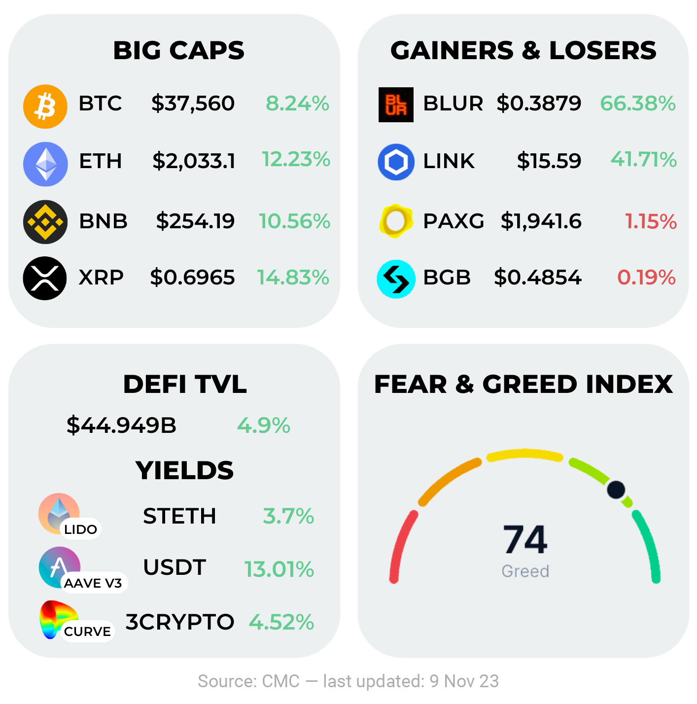 Bitcoin's strong performance this week, touching 38k, may suggest a Bitcoin ETF is closer than we think. Ethereum and other altcoins are not lagging behind anymore. The top performer of the week was BLUR, the token of the NFT marketplace with the most volume. LINK, the oracle provider, was also a strong performer. Overall, the market was green, with the only exception of red from Tether and Paxos’s gold coins. DeFi TVL is rising, and stablecoin rates on Aave too.