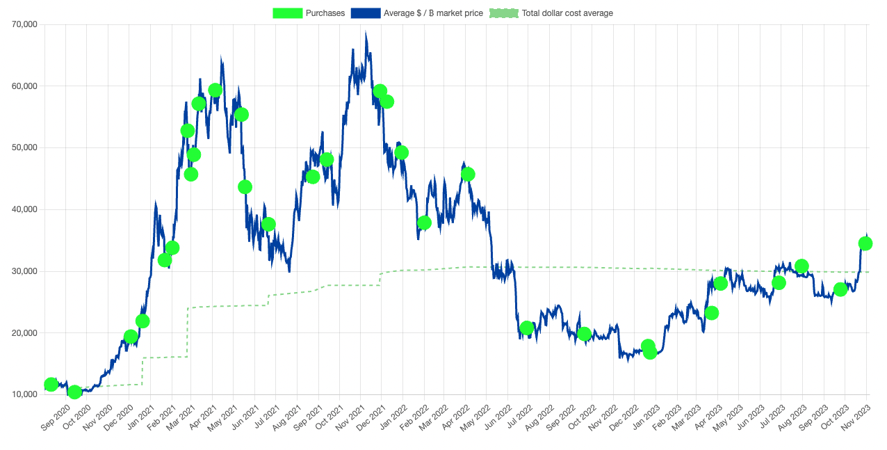 Saylor’s dollar-cost-averaging seems to be the most successful, up $860M (18%) on its investment. Microstrategy currently holds $5.8B in BTC, acquired at an average price of $29874.