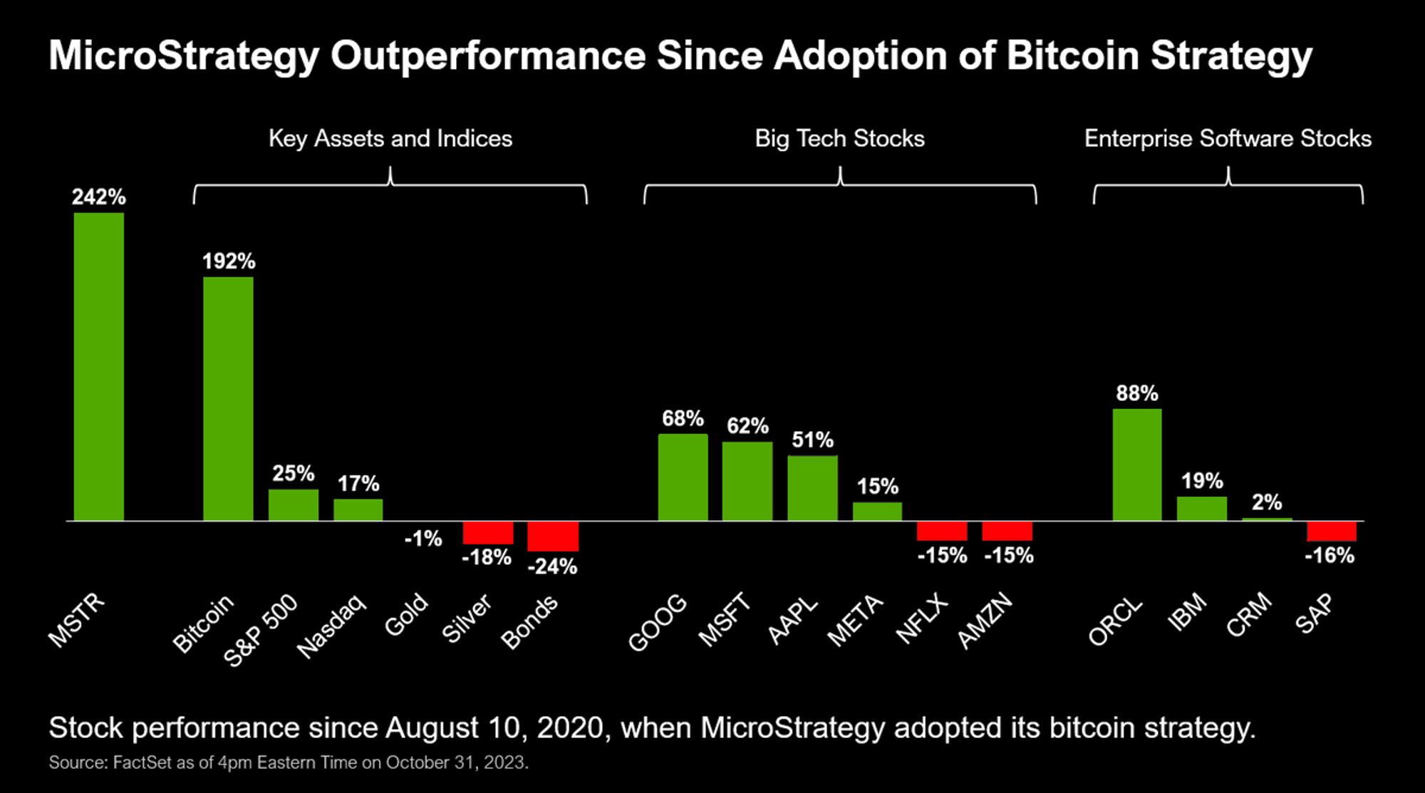 Microstrategy, other than loving BTC to its gut, is also quoted on the NASDAQ with the MSTR ticker. Not only they’re up big, but MSTR has been outperforming BTC itself — the very pillar of its strategy — by a 50% figure.