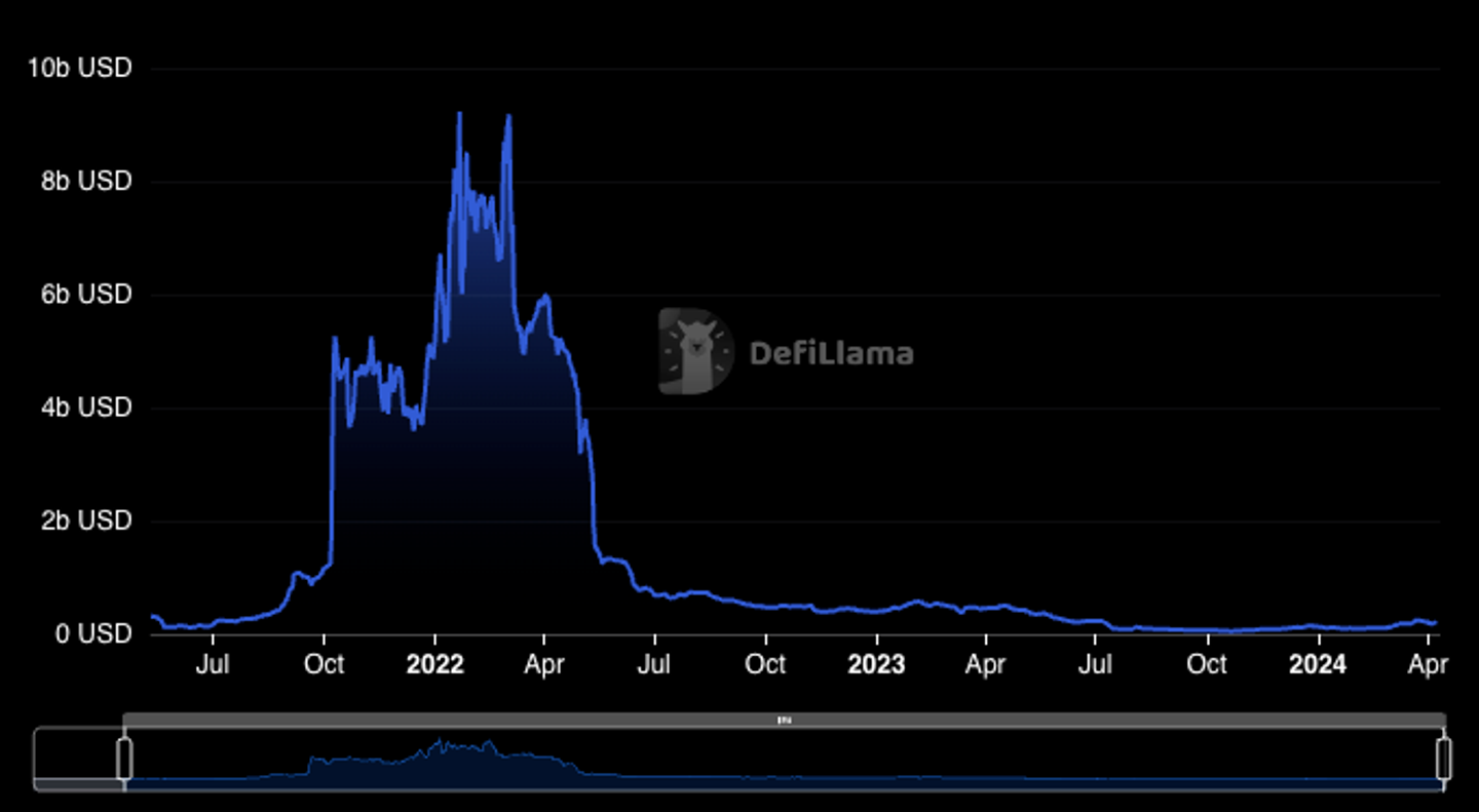 Fantom was once one of the most promising Layer 1 blockchain out there — then the bear market came, a few protocols suffered exploits, and then the Multichain bridge securing the blockchain’s assets went rogue resulting in the depeg of stablecoins and wrapped assets such as ETH and BTC. Its TVL reached $9.2B in early 2022, and is now sitting at $236M two years later, a 97.5% bloodbath.