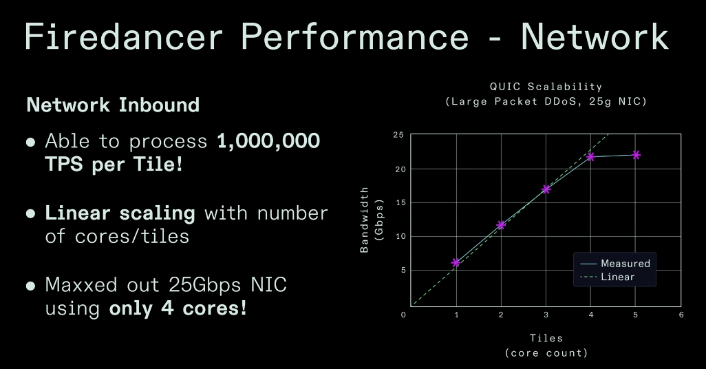So, just how fast are we talking? With only a 4 CPU core setup, Firedancer can process 1 million transactions per second per tile. For context, most currently operate machines with 16 to 32 cores, while Solana's current capacity is up to 65,000 transactions per second.