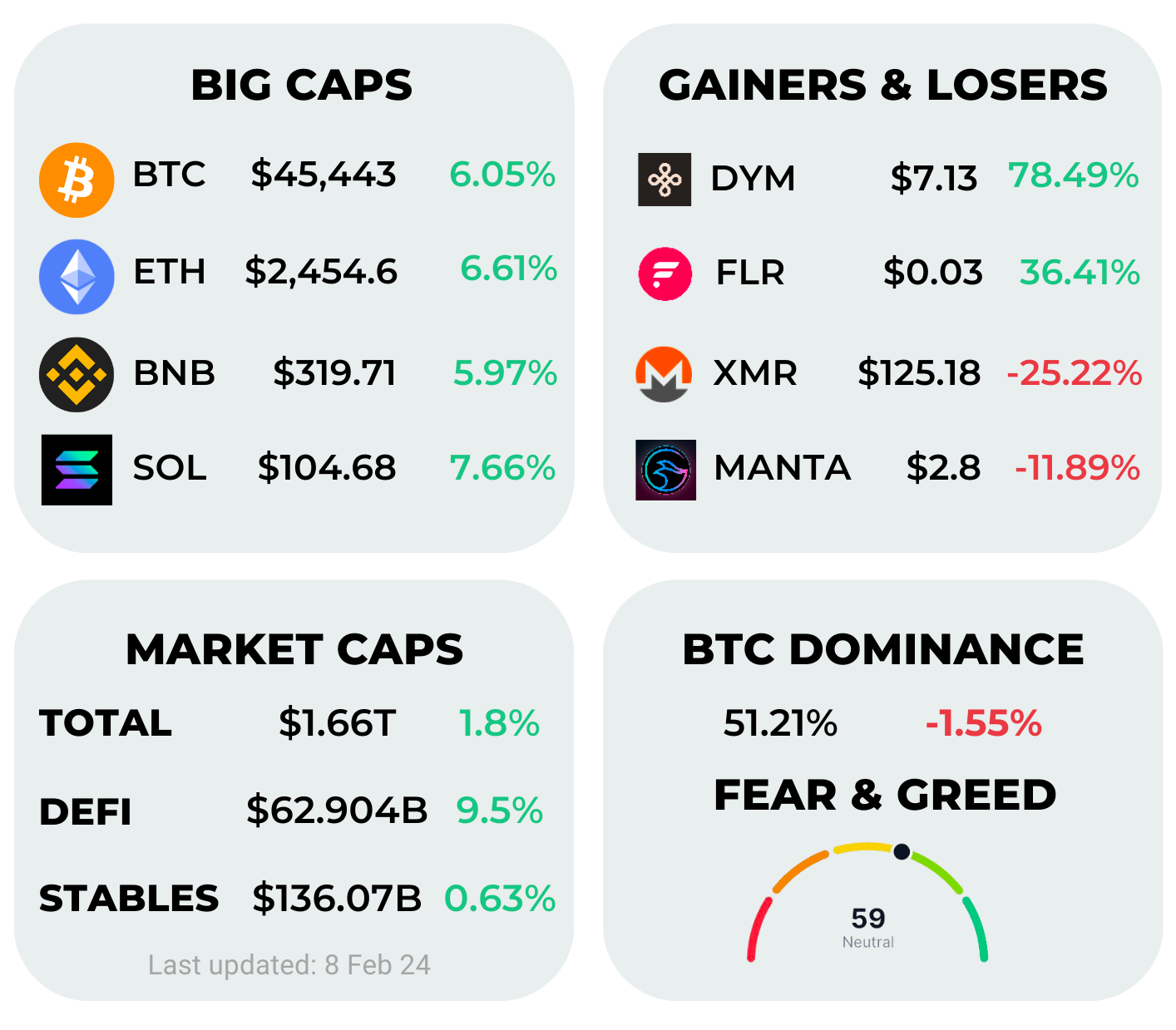The markets are looking good once again! Bitcoin saw a strong 6% increase this week, hitting $45,000, with Ethereum following suit. Despite Solana experiencing a 5-hour outage, its token is pumping nevertheless. This week's top performer is Dymension's DYM, launching at a whopping $6 billion valuation, but we'll dive into that later. On the other hand, XMR took a hit after being delisted by Binance. A notable highlight is the DeFi Total Value Locked (TVL), which surged by 9.5% in just one week—an uncommon occurrence indicating increased deposits into DeFi protocols. Despite the fear and greed index not reaching the greed zone, there's evident demand in the market to buy the dips.