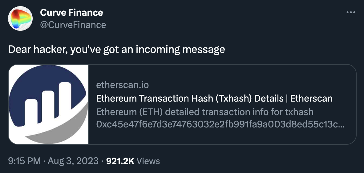 As a response to the breach, Curve took a direct approach by sending an on-chain message to the hacker(s), offering them the chance to retain 10% of the stolen funds as a bounty and assuring them no legal repercussions if they returned the remaining 90%— quite a good deal for them!