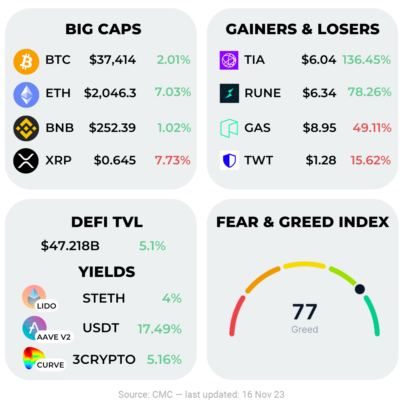 Prices are looking up also this week, with a surge in ETH following Blackrock's filing for an Ethereum ETF. ETH has consistently underperformed BTC in the last months, but this recent spike in the ETH/BTC chart suggests a potential decoupling. The top performer of the week is TIA, the token of Celestia, which is introducing a revolutionary blockchain design (we covered it in more detail here). RUNE, the token of Thorchain, a cross-chain swapping protocol, is also performing very well. DeFi TVL and the Fear&Greed index are both on the rise. Could this be the start of a new bull market, or it’s just a bump? Time will tell.