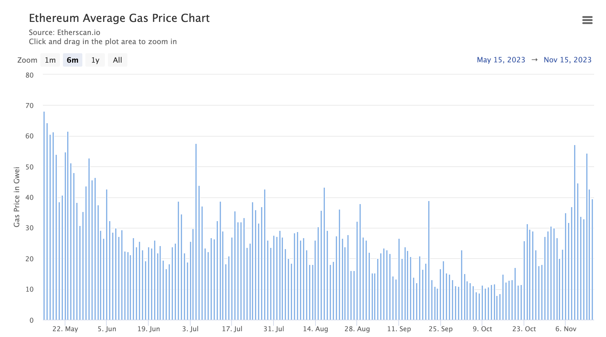 Average Ethereum gas fees, a measure of network congestion, have been consistently increasing in the last month, indicating a growing demand for block space.