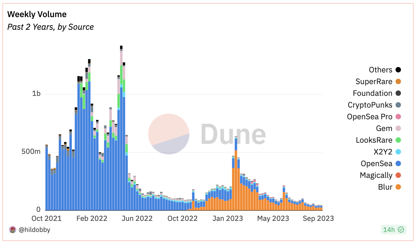 The reduction in gas fees can mainly be attributed to a decline in user activity within NFTs trading and layer-2 networks. As illustrated in the chart below, weekly trading volumes for NFTs have reached their lowest point in two years.
