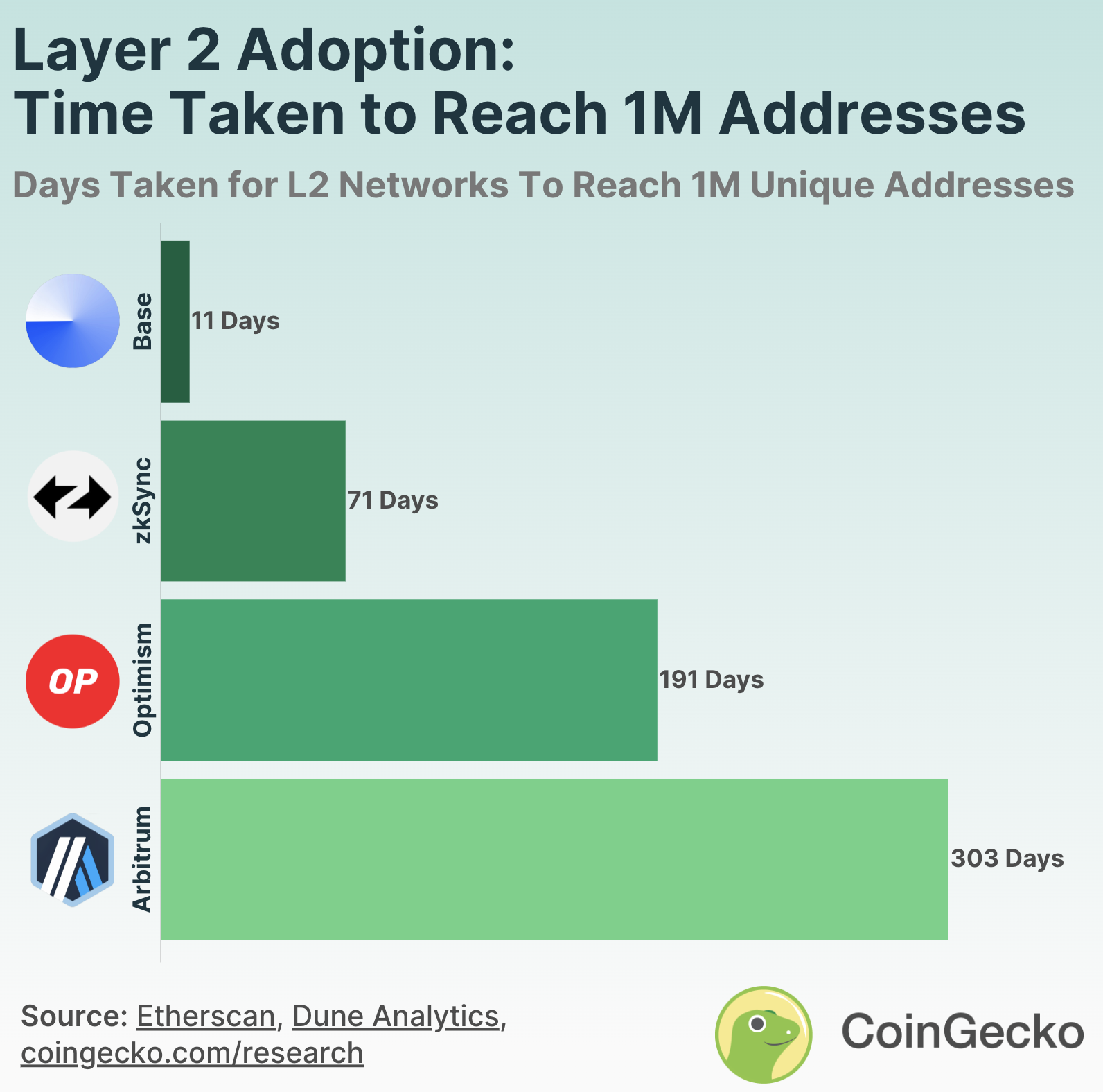 Did you know? Base is the fastest-growing L2 chain. It only needed 11 days to reach 1M users. Optimism needed 191 days, while Arbitrum 303.