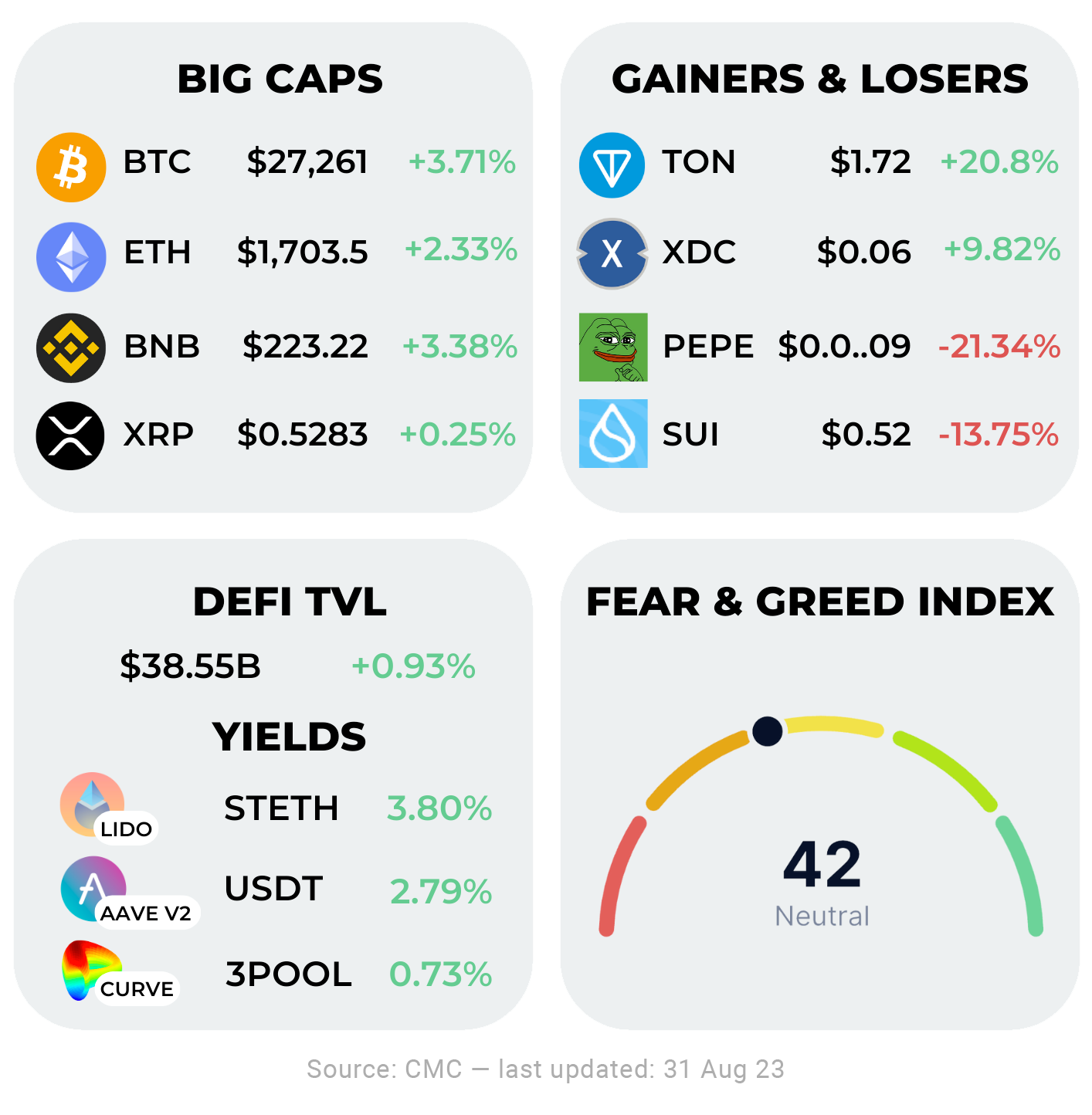 Grayscale won against the SEC in court, lifting the hopes for a Bitcoin ETF. A $15M market sell order of $PEPE hits the market and Base reaches 1M users in just 11 days.
